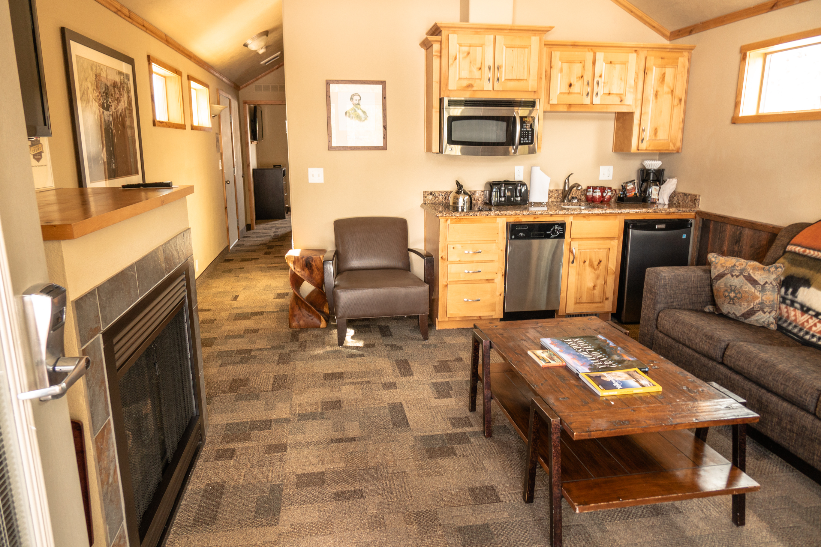 - Yellowstone Cabin: stand-alone cabin, 2 bedrooms (1 king, 1 queen), separate living area