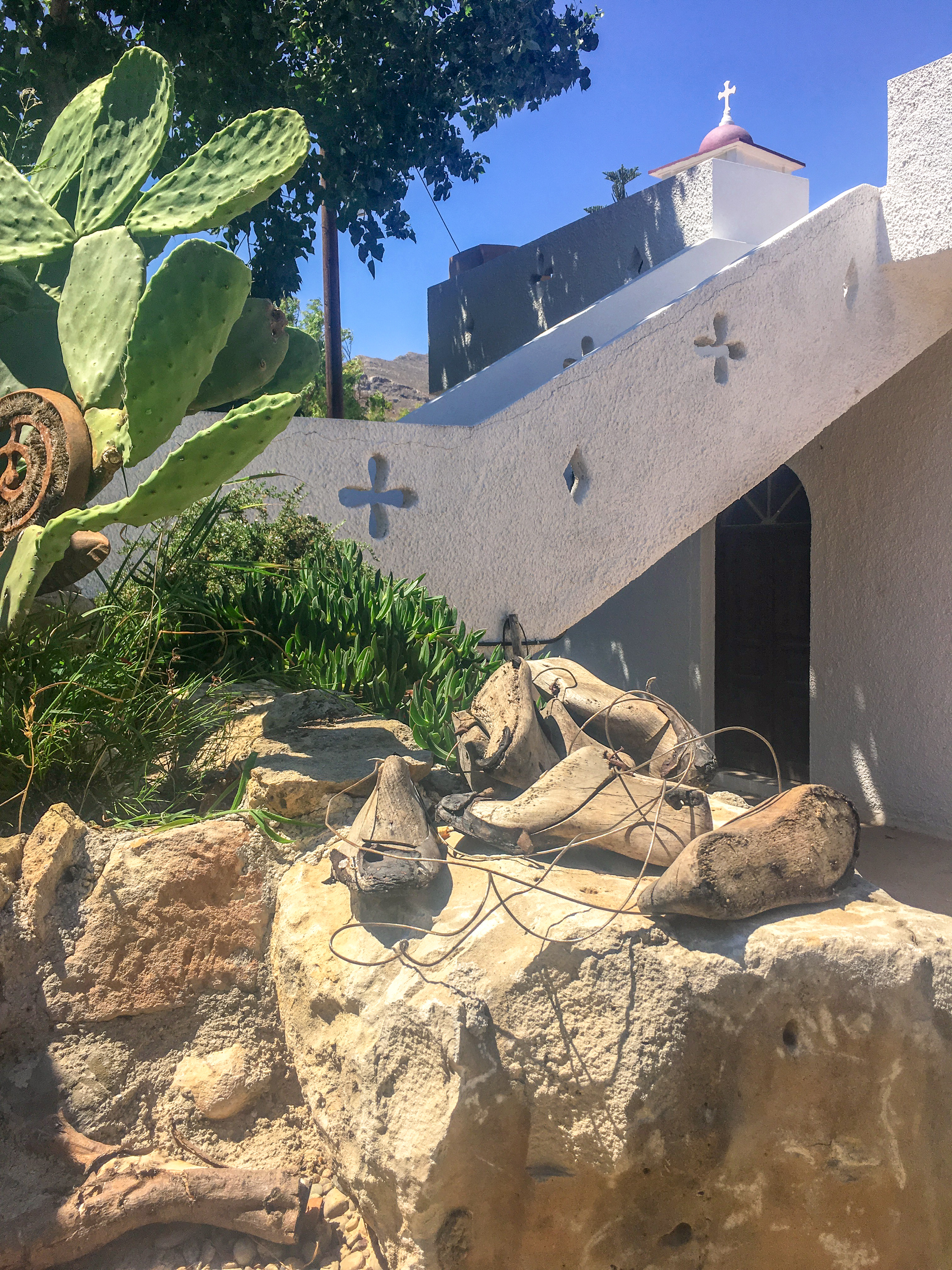 - Hike from Kaliviani: this is the most aggressive option. Distance is 10 km (6 miles) each way—3 hours in the morning and 3 more in the afternoon, across dry rocky landscape. Wear a hat and bring plenty of water & sunscreen.